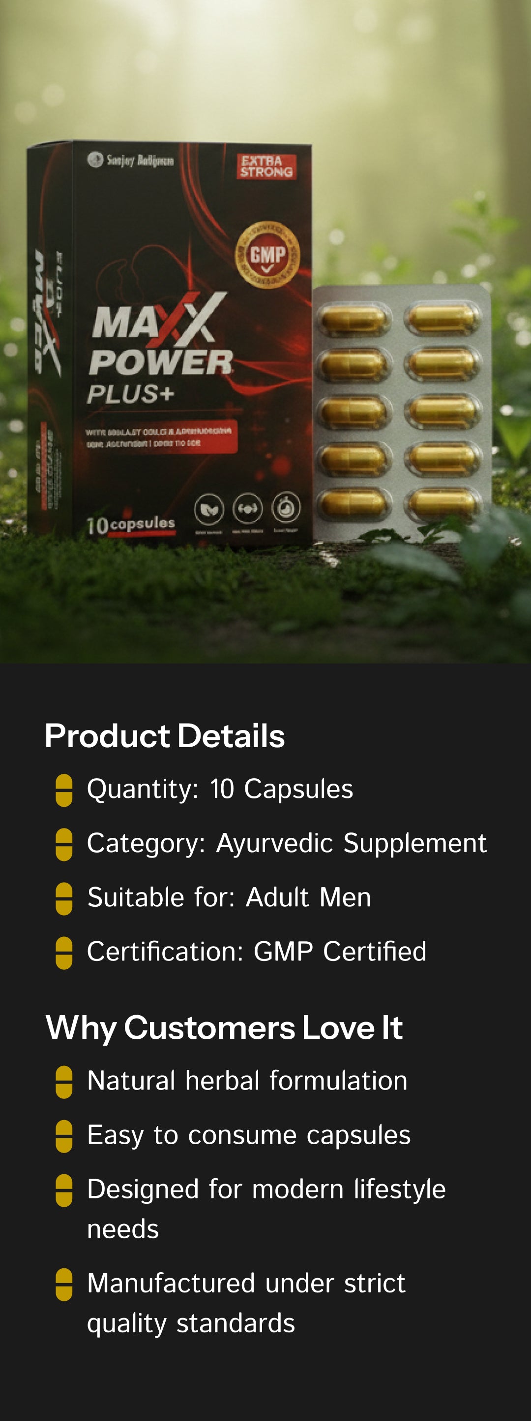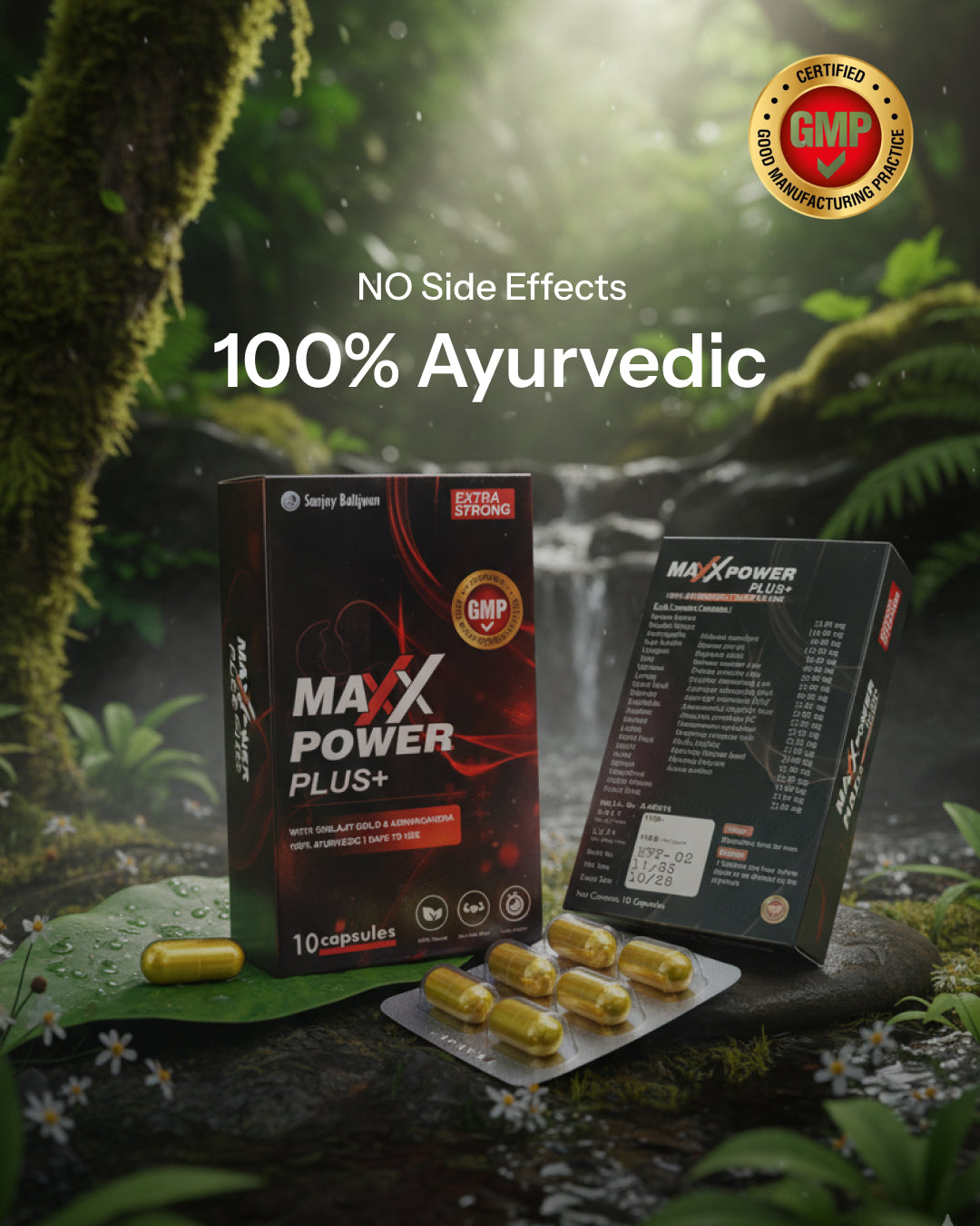 MAXX POWER PLUS+ is made using traditional Ayurvedic herbs known for supporting energy, stamina, and vitality, combining ancient wisdom with modern quality standards.
